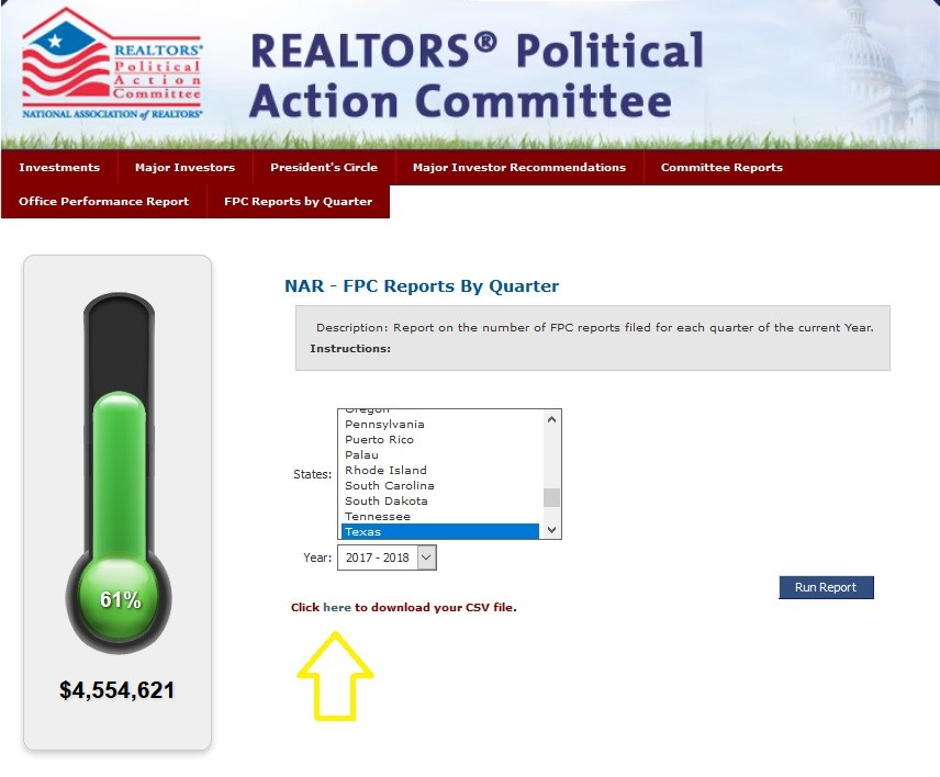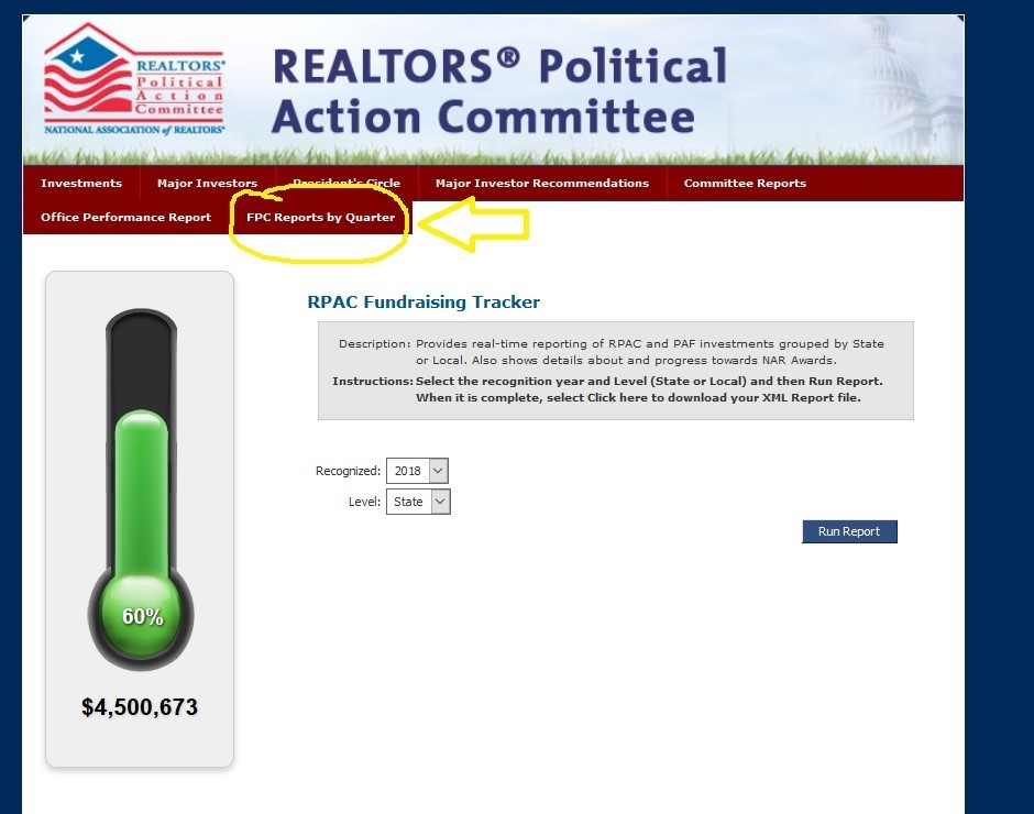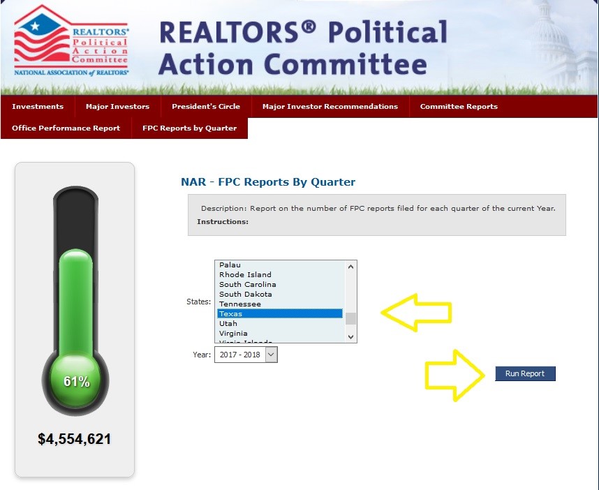 Each quarter, Federal Political Coordinators (FPC) are required to file at least one field report describing any interactions they had with their Member of Congress or Senator. As members of the FPC Advisory Committee or as Government Affairs Directors, NAR has created a new tool for you to generate the field report tally on the FPCs in your state at any time. Please follow the simple step-by-step process below.