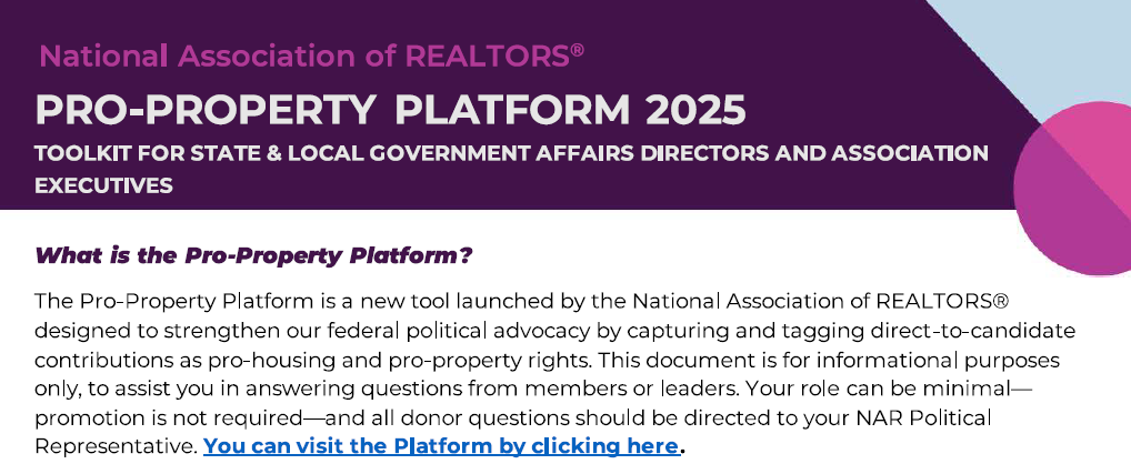 If you are a new Government Affairs Director or serve in a similar role, or a REALTOR® Party programmatic role, please visit the GAD Directory to on board your new staff person. He/she will receive a new GAD welcome email, will be added to GAD communications and will receive information about registering for the next REALTOR® Party Advocacy Orientation for New GADs and AEs.