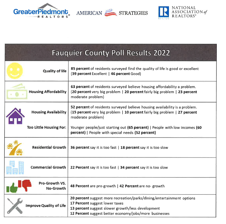 Debbie Werling, the association’s Executive Officer, brought Fauquier County’s Chief of Planning into the process, and together with a number of REALTOR® members over the course of several Zoom meetings, they collaborated on how the poll would be crafted. “We asked the County, ‘What’s important for you to know? What is it you want to ascertain about local attitudes and priorities?’” she recalls. “That’s how the questions were formulated, so the county officials were getting exactly what they needed. She adds that the expertise, responsiveness, insight, and guidance they received from American Strategies was tremendous. “They were super amazing to work with, and really refined what we were trying to achieve.”