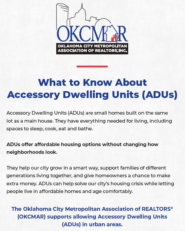 Through multiple drafts, opposition, and compromises, the Oklahoma City Metropolitan Association of REALTORS® shepherded a proposed ordinance that would allow Accessory Dwelling Units in the heart of the city. The REALTOR® Party’s Land Use Initiative program provided legislative analysis that helped clarify key points for its successful adoption....