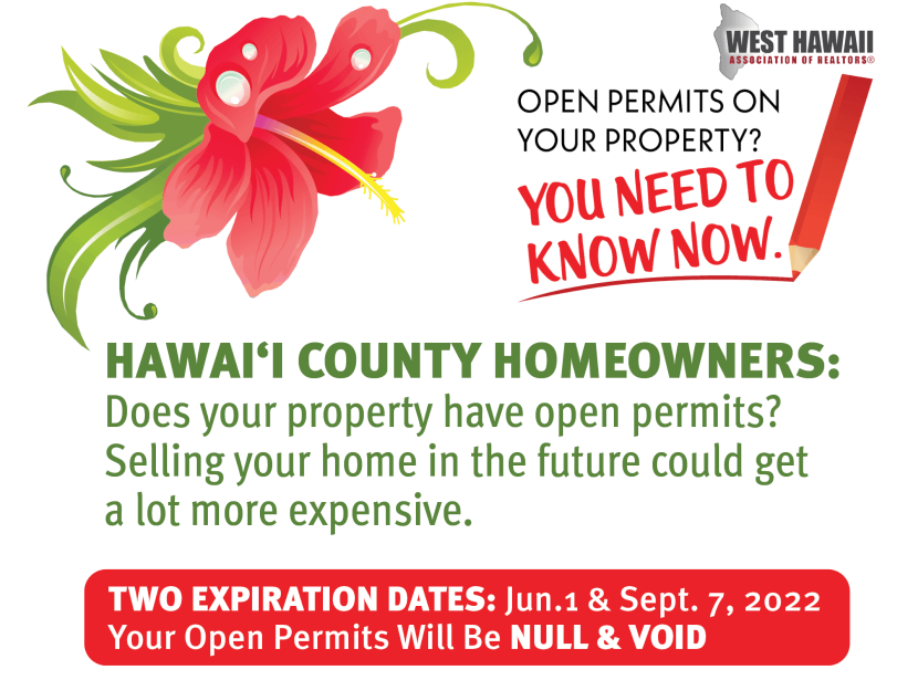 To learn more about how the REALTORS® are working to protect homeowners on the Island of Hawai‘i, contact Taylor Rodamer, Association Executive of the West Hawai‘i Association of REALTORS®, at taylor@westhawaiirealtors.com or 808.329.4874. To see the landing page the organization created to reach and help consumers, visit: https://campaignprogram.com/Hawai‘i-county-permits. West Hawaii Association of REALTORS® Alerts Property Owners About a Deadline on Open Construction Permits that Could Lead to Prohibitive Unexpected Costs